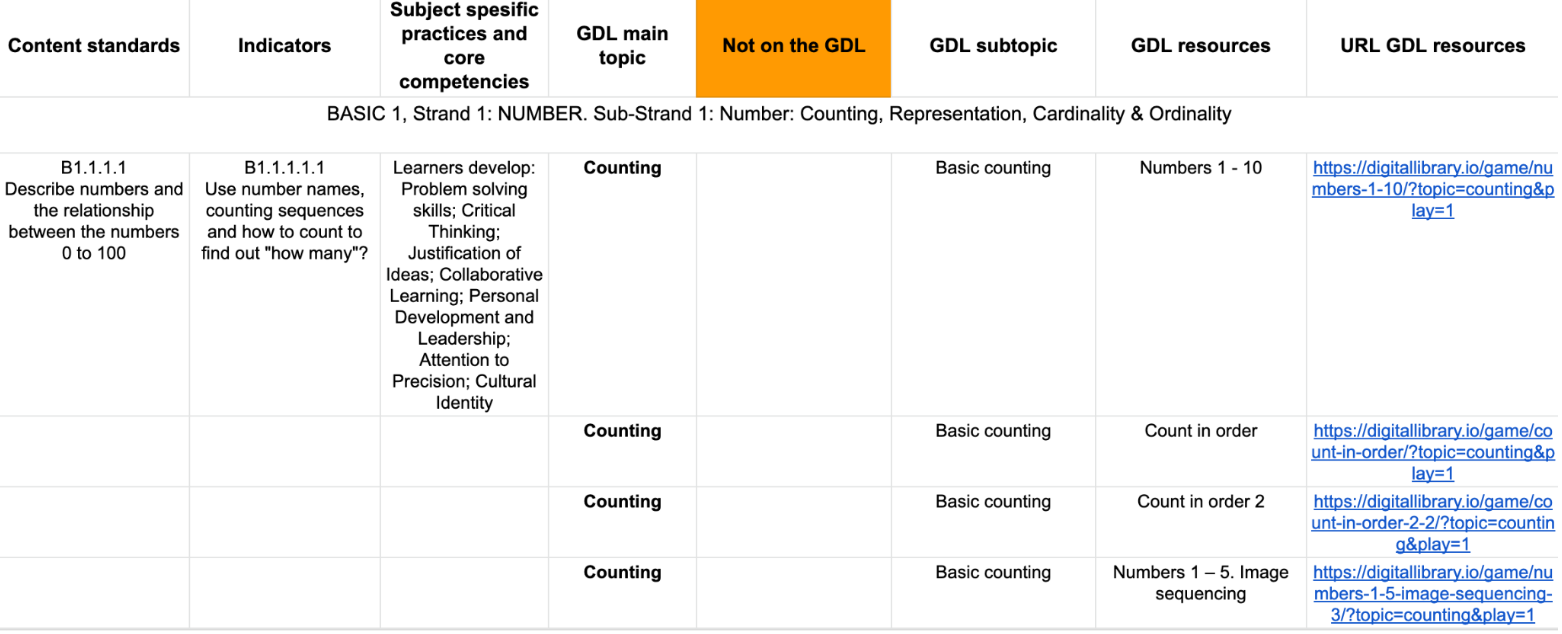 The GDL content can be curriculum aligned to any curriculum or learning structure. Ghana is the first country where the GDL resources are integrated into the national curriculum for Mathematics and English. The GDL team has mapped the GDL content to the levels 1, 2 and 3 for Mathematics and English. In Mathematics, our content covers most of the content standards from Basic 1 through 3. We have looked at each of the content standards, and mapped them with specific early math games from the GDL in a spreadsheet. This is an example from the spreadsheet: