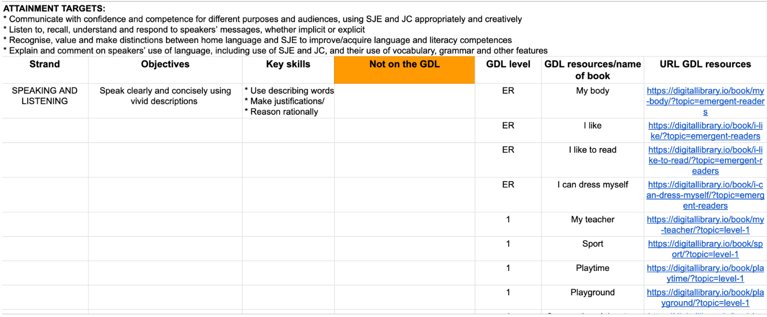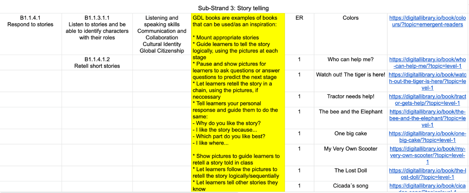 In English (Reading), the GDL content consists of books on different levels and topics. There are books for Emergent Readers with wordless books, as well as books on Level 1 through 5 and Read Aloud. Here is an example from the spreadsheet:
